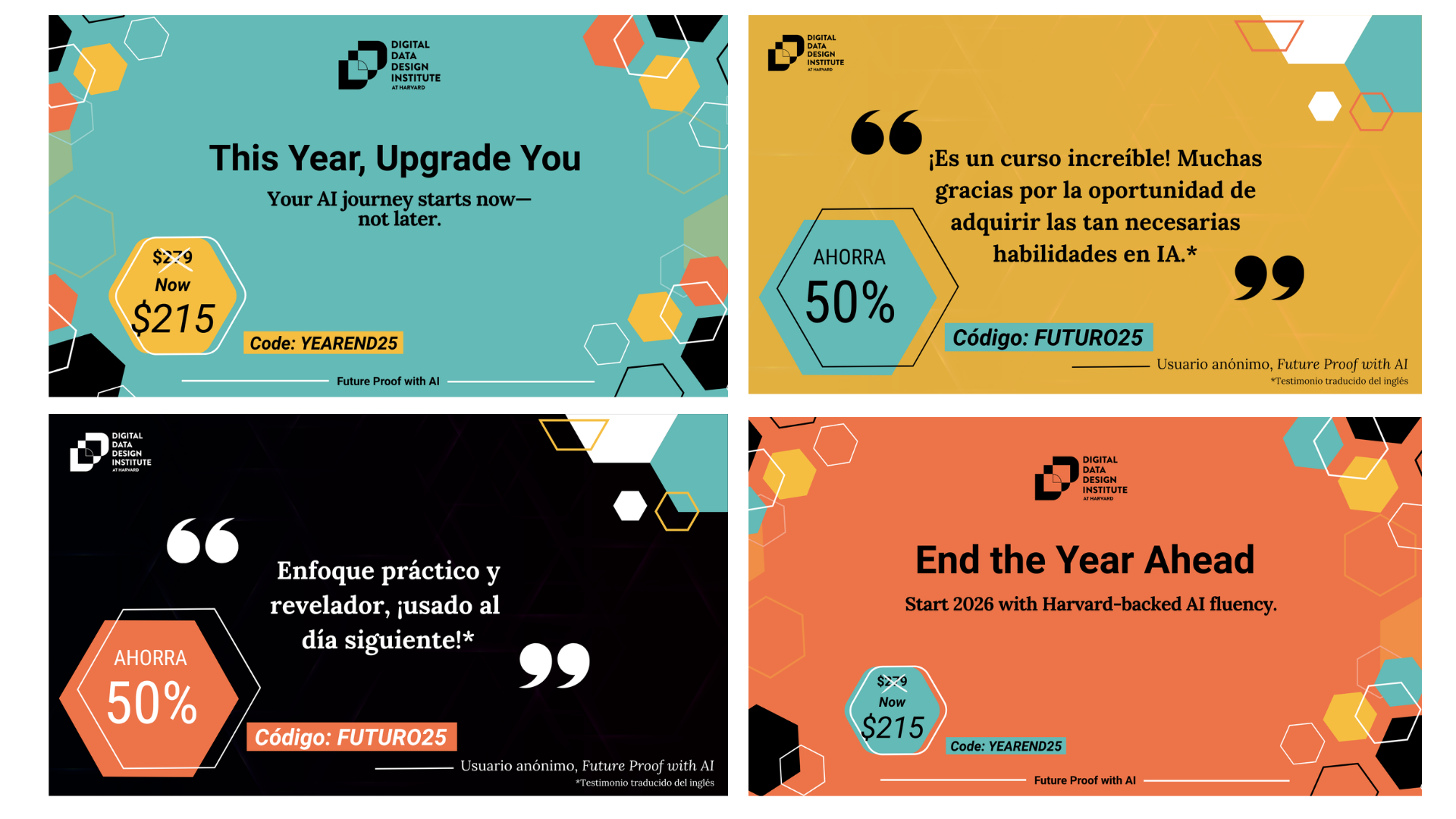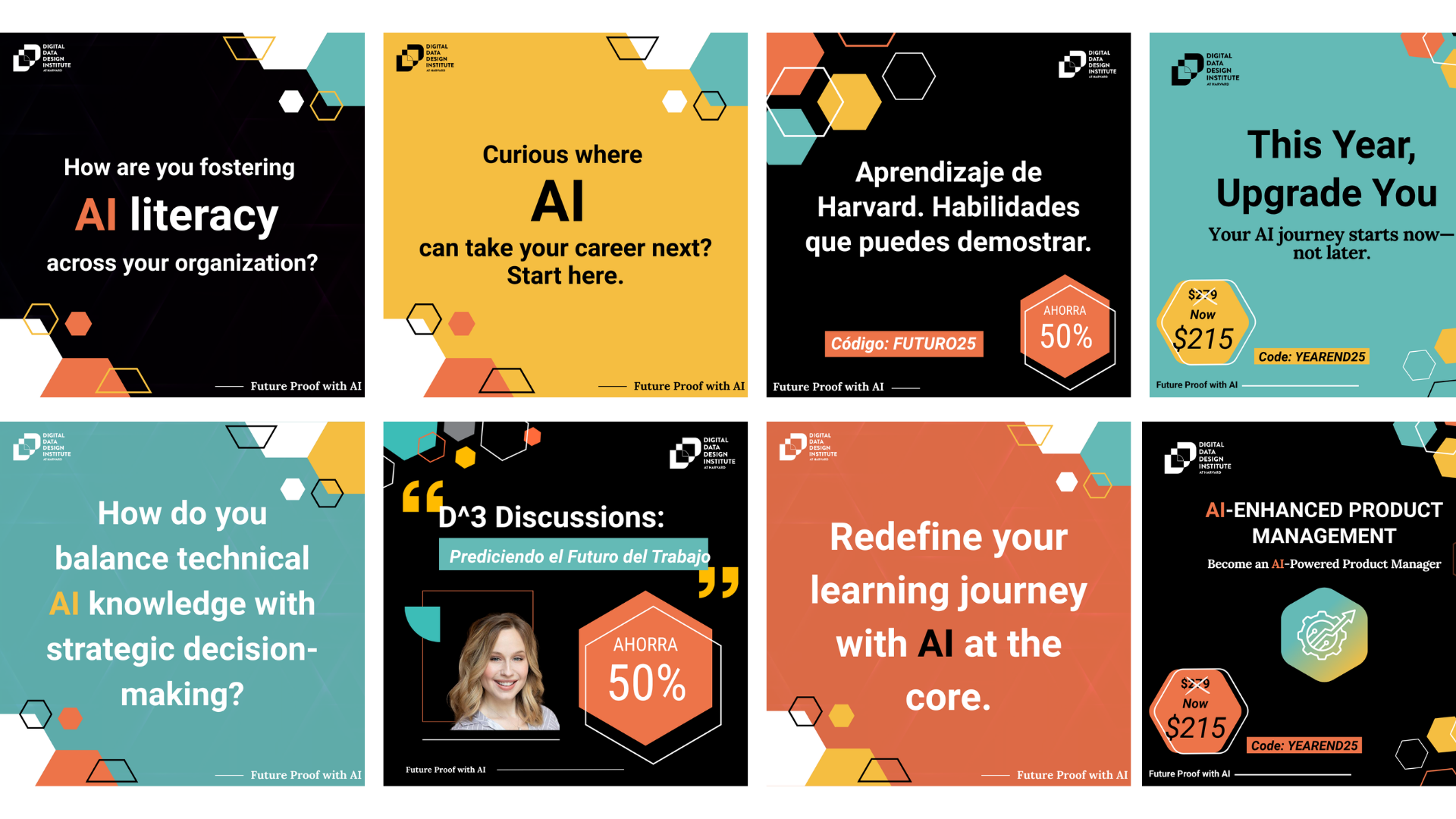 To drive awareness and traffic, I designed paid and organic social assets that promoted D3’s AI learning programs and upcoming conferences. The creative emphasized clarity, strong hierarchy, and benefit-led messaging designed to quickly communicate value in fast-scrolling environments.