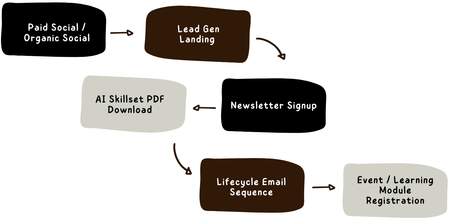 I began by mapping the full user journey from awareness to retention. Social campaigns (both paid and organic) directed users to focused lead generation landing pages promoting AI learning modules and downloadable AI skillset resources. Once users converted, they entered a structured lifecycle flow that included a welcome email, resource delivery, follow-up promotions, and ongoing newsletters.