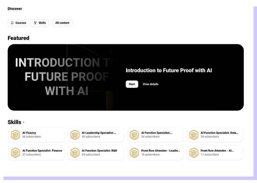 The Sana.ai platform serves as the core learning environment for Future-Proof with AI. I designed the end-to-end learning experience, focusing on modular content structures, clear navigation, and interaction patterns that support self-paced learning for busy professionals.